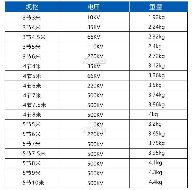 1、10kV,35kV,66kV,110kV,220kV絕緣操作桿分別要通過在45kV,95kV,175kV,220kV,440kV打耐壓,保持1min不擊穿。